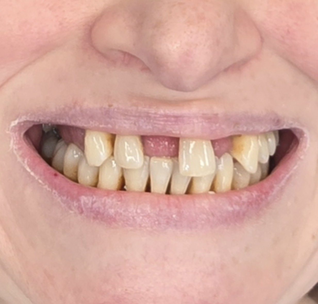 Our young patient C. X. had an accident at a young age which led to her losing 2 of her front teeth. The patient was referred to us by an Oral Surgeon who had attempted bone graft twice but couldn’t develop enough bone to place implants. We had to utilize pink porcelain to restore the gum line and replace missing teeth by a 4-unit bridge. The result is a beautiful smile considering all the limitations.